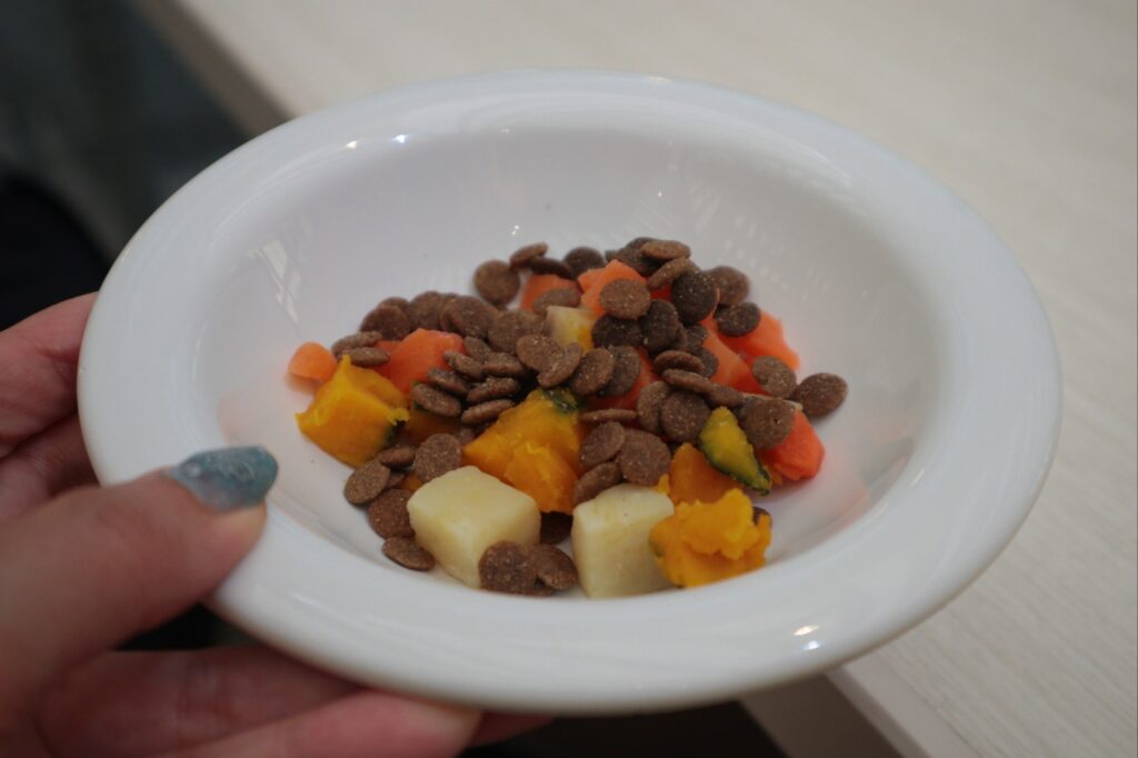 2種類のドッグフードと蒸したさつまいも、蒸したカボチャ、蒸した人参です。