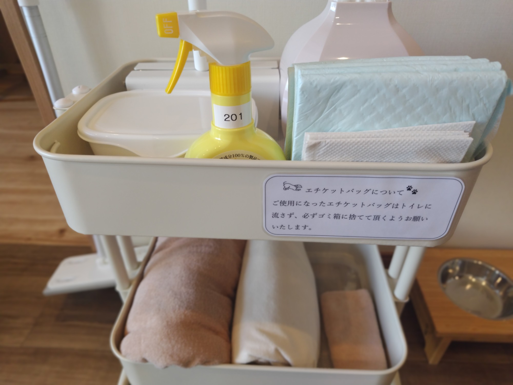 トイレシーツ、ウンチ袋、消毒液、バスタオル、トイレットペーパー、防水シートなどなど。