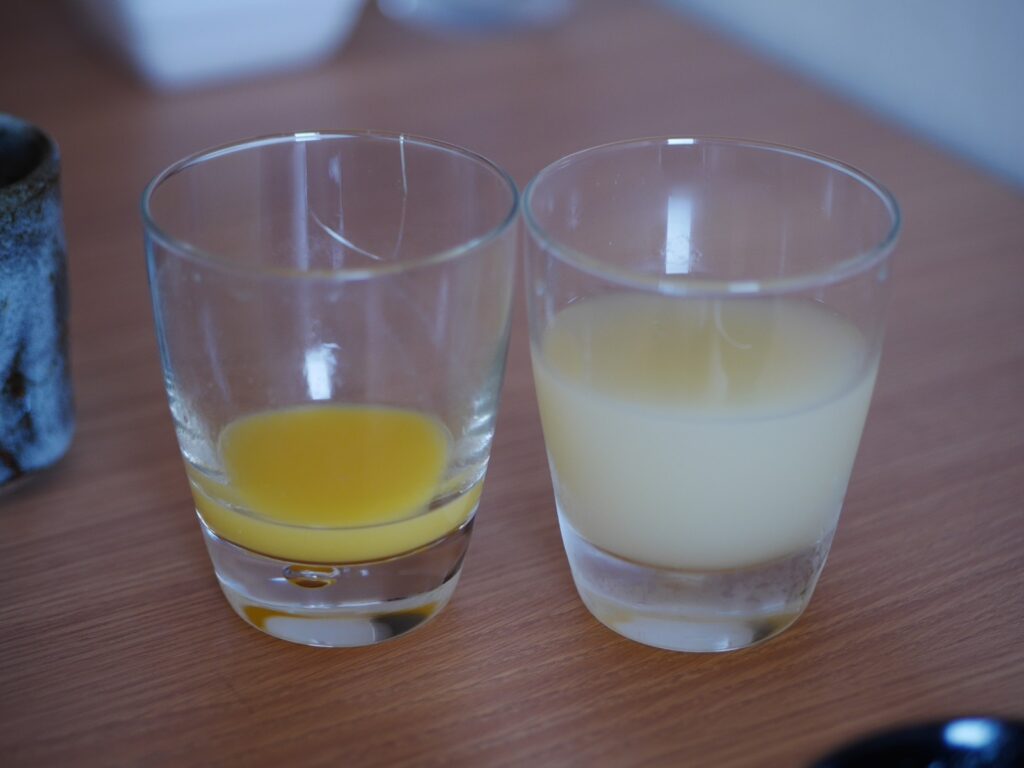 右がグレープフルーツ、左がオレンジで色がぜんぜん違ってました。