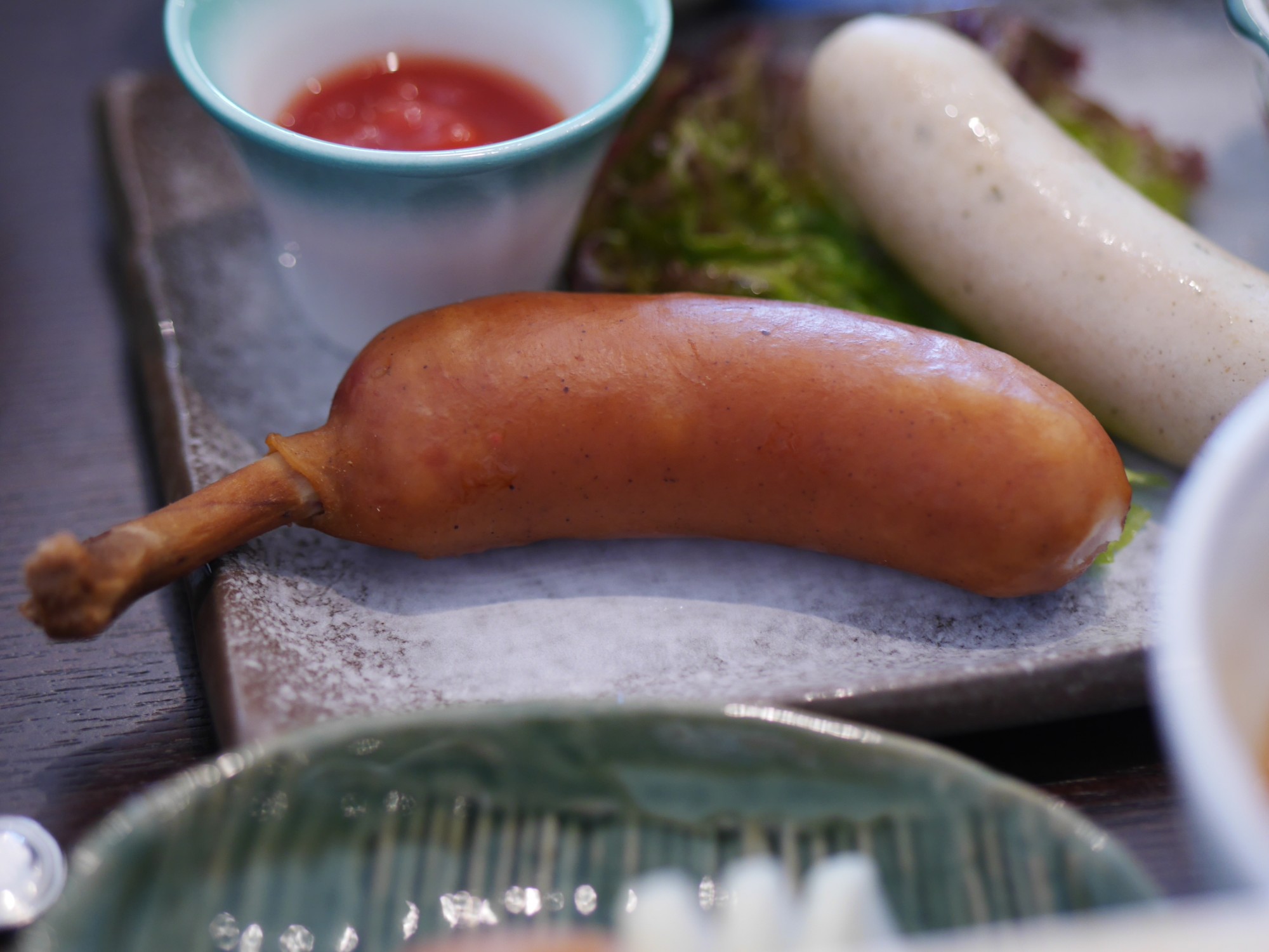 この骨付きソーセージ、どう考えても適当にあったものを出した料理じゃないですよね。