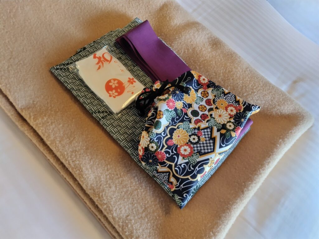 和柄のきんちゃく袋の中に歯磨きセットなど入っていたんですけど、この袋は持ち帰り可能とのことで有り難く頂いてまいりました💗