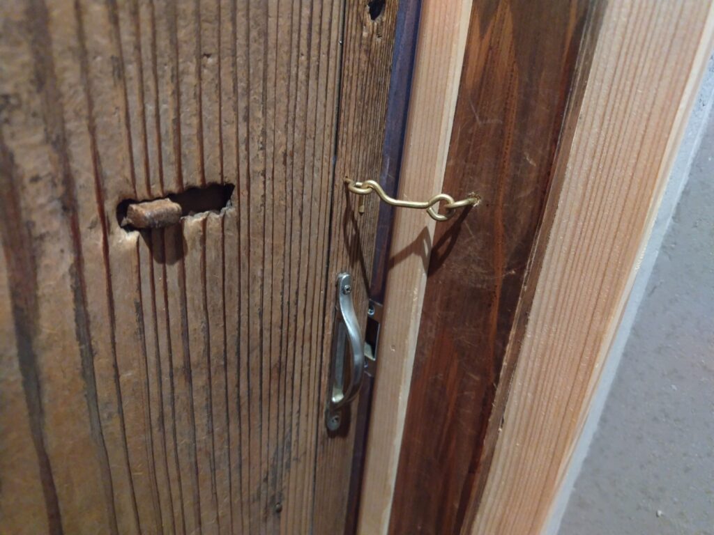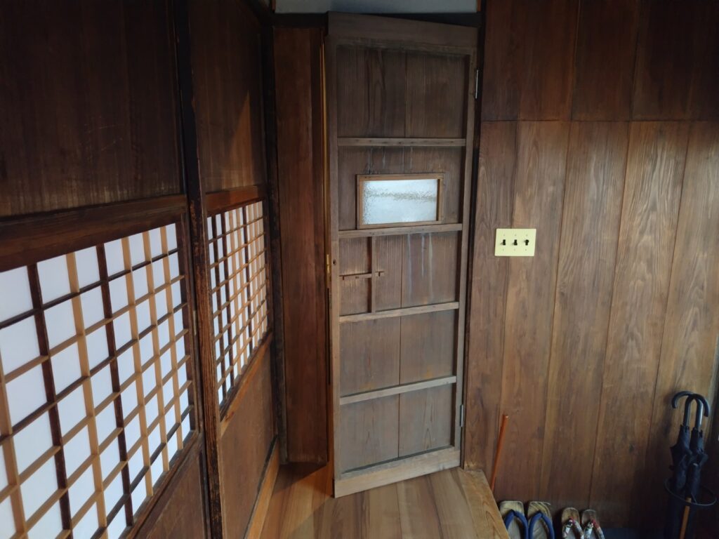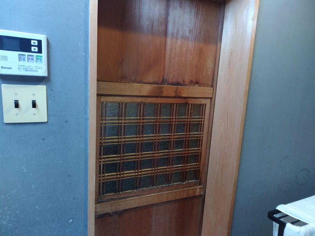 脱衣所から洗い場へ入るところの扉は、昔のままの扉が再利用されてます。