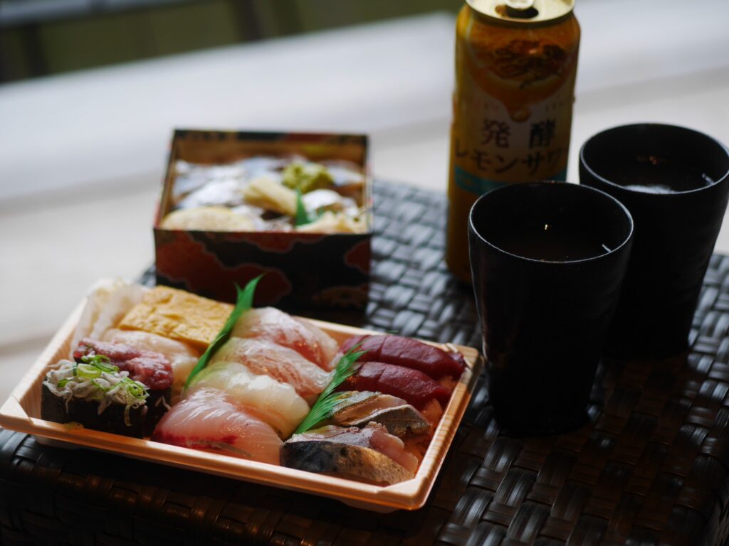 上の写真の手前の握り寿司は三島の「寿司処もろこし」で事前予約して購入しました!