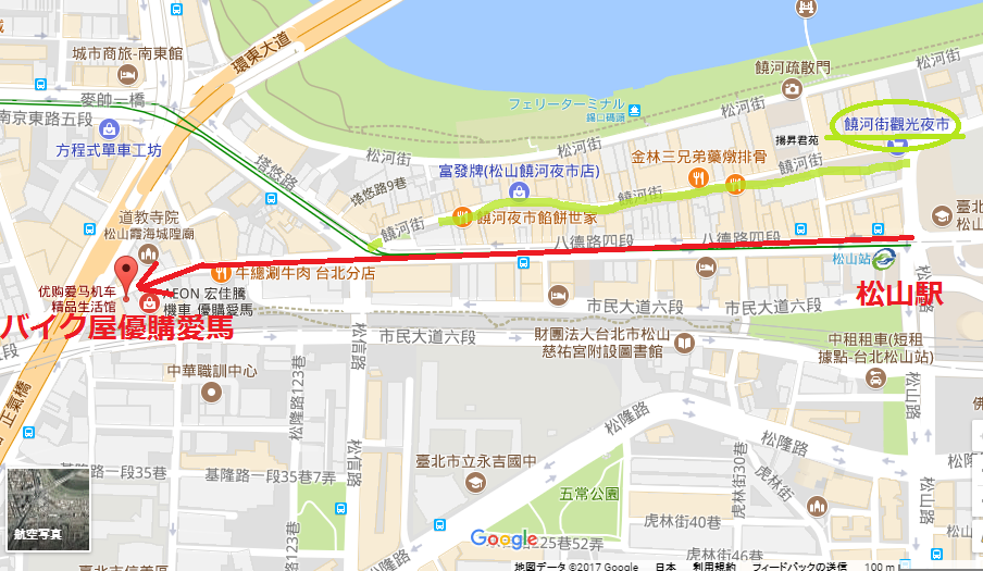 ちなみに、緑でラインを引いたところは有名な饒河街夜市です。